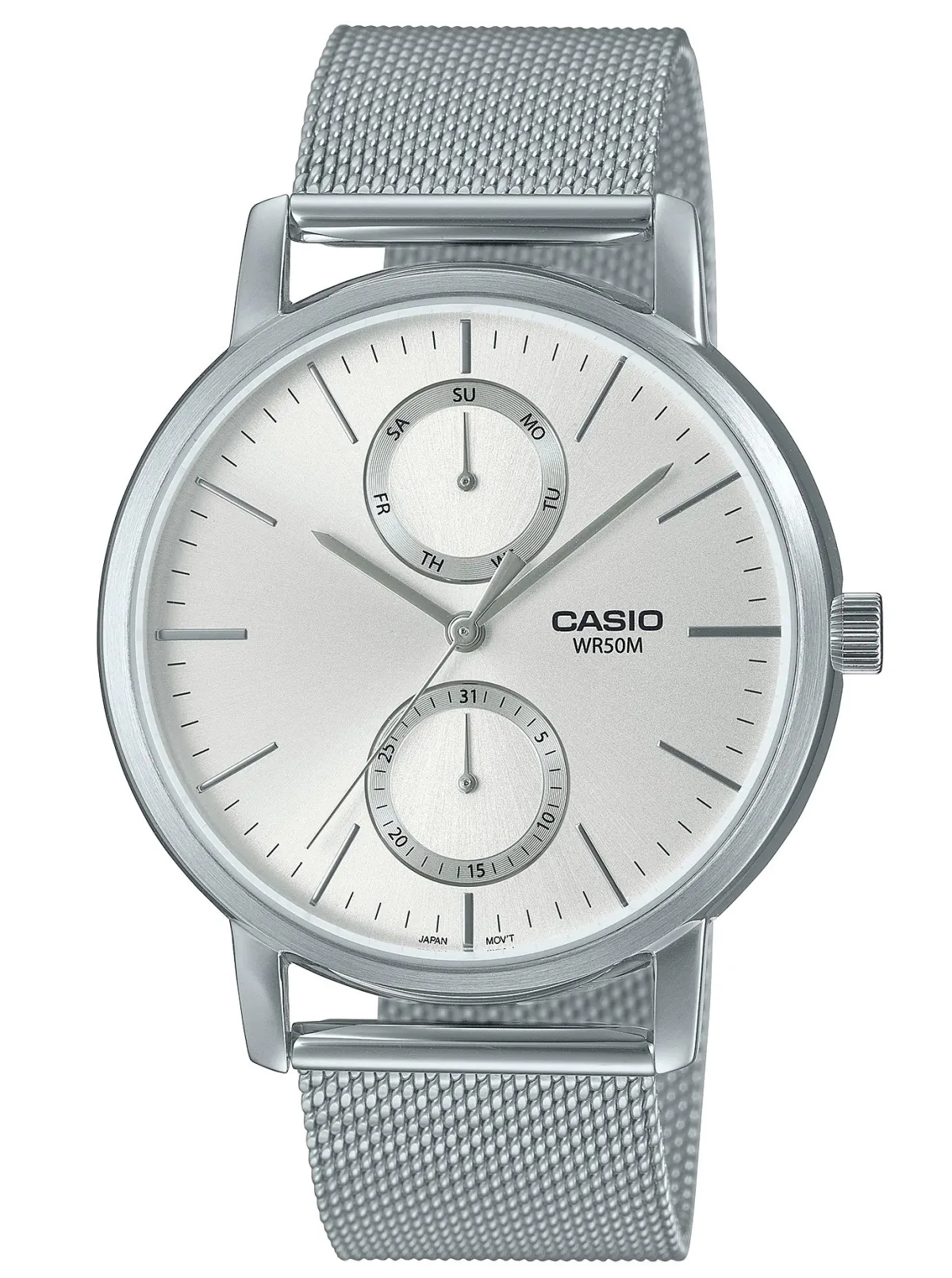 Deze Casio Collection Multi Dial Horloge voor Heren is het perfecte sieraad om te dragen of als cadeau te geven. De zilveren ronde kast van 40 mm, gecombineerd met de comfortabele zilveren roestvrijstalen horlogeband, zorgt ervoor dat je van dit prachtige horloge kunt genieten zonder enige compromissen. Aangedreven door een hoogwaardig quartz uurwerk en waterbestendig tot 5 bar, blijft je horloge tikken. Dit is een perfecte elegante en casual horloge voor jou, het is een geweldig cadeau voor familie of vrienden. - Het horloge heeft een kalenderfunctie: Dag-Datum. Hoogwaardige 21 cm lange en 20 mm brede zilveren roestvrijstalen band met een vouwsluiting. Kastdiameter: 40 mm, kastdikte: 10 mm, kastkleur: zilver en wijzerplaatkleur: zilver.