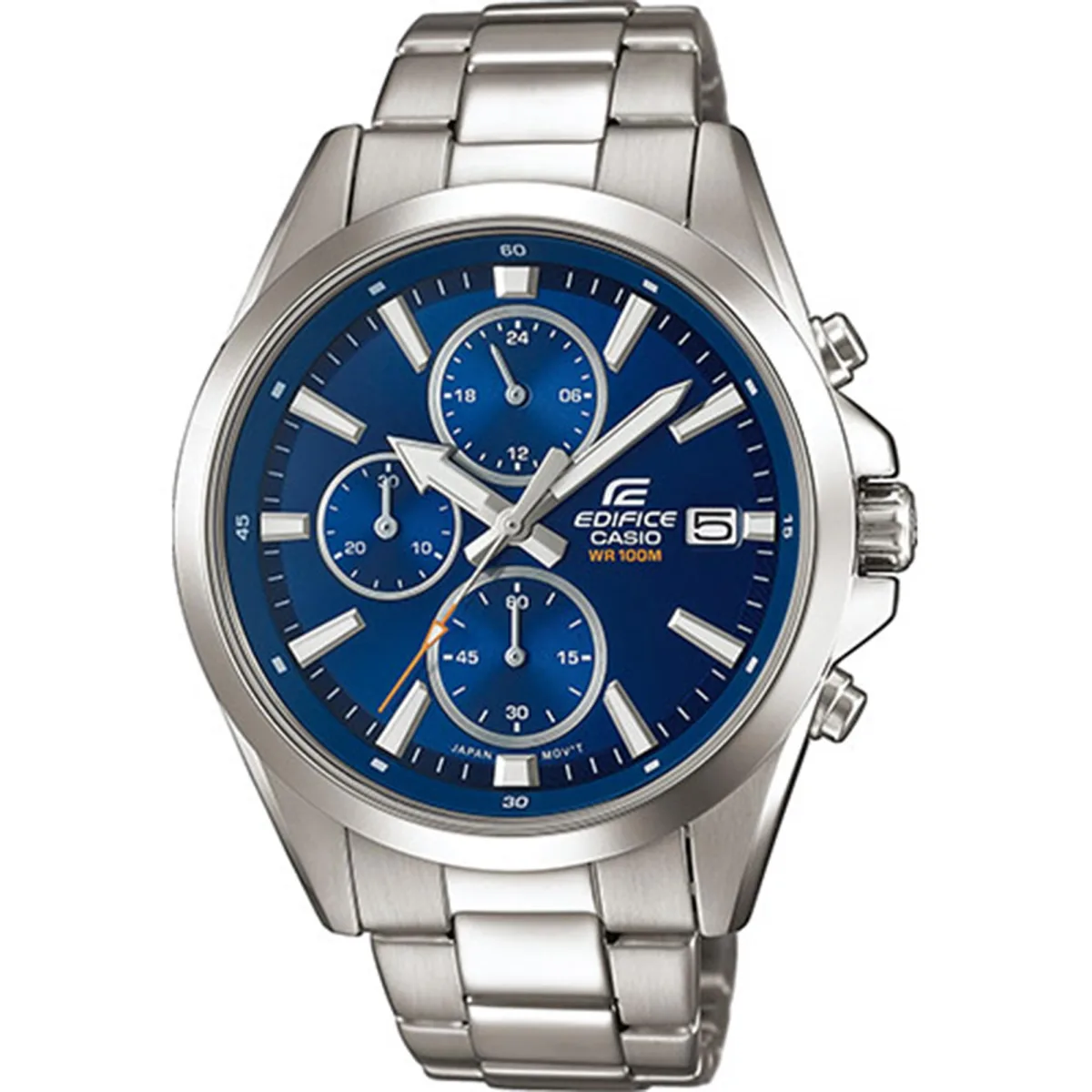 Dit Casio Edifice Chronograaf Horloge voor Heren is het perfecte tijdpiece om te dragen of cadeau te geven. De zilveren 42 mm ronde kast in combinatie met de comfortabele zilveren roestvrijstalen horlogeband zorgt ervoor dat je van dit prachtige horloge kunt genieten zonder compromissen. Aangedreven door een hoogwaardige Quartz movement en waterdicht tot 10 bar, zal je horloge blijven tikken. Sportief en met een modern design, perfect voor alle mannen die van sport houden! - Het horloge heeft een kalenderfunctie: Datum, Stopwacht, 24-uurs weergave, Luminieuze Wijzers, Luminieuze Cijfers. Hoogwaardige 21 cm lange en 20 mm brede zilveren roestvrijstalen band met een vouwsluiting met drukknop. Kastdiameter: 42 mm, kastdikte: 12 mm, kastkleur: Zilver en wijzerplaatkleur: Blauw.