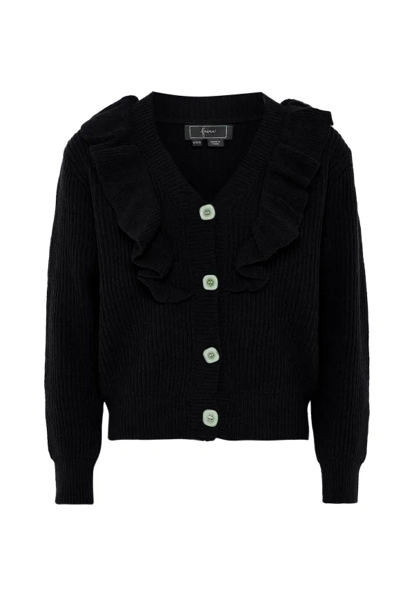 Design: Geribd ceintuurtje; Type sluiting: Knoopsluiting; Halstype: V-hals; Motief: Effen; Details: Volant; Extra's: Fully fashioned; Pasvorm: Normale pasvorm; Armlengte: Lange mouw; Lengte: Normale lengte