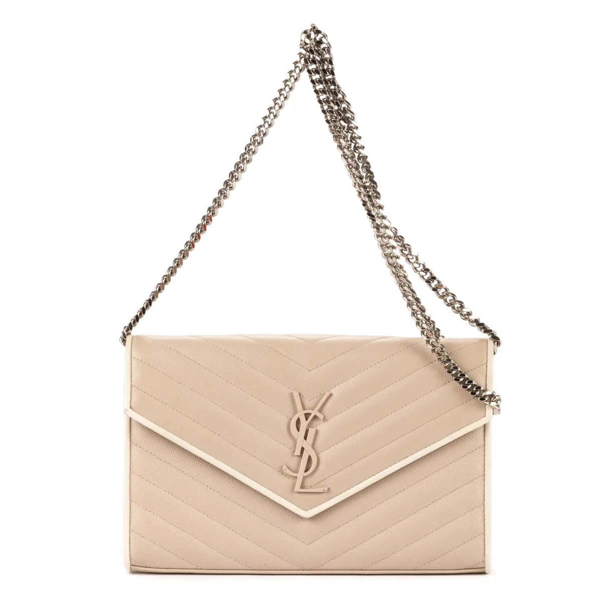 Yves Saint Laurent Tassen Cassandre Enveloppe Chain Wallet Schoudertas in de Taupe/Wit Kalfsleer in de Zilver hardware. Het product is in In Perfecte Staat (AA). Afmetingen: 22x14x4 cm Inclusief accessoires: None BrandCo Paris vindt zeldzame artikelen in de beste staat voor ongelooflijke prijzen. Het is de moeite waard om geduldig te zijn! Koop met vertrouwen: alle artikelen van BrandCo Paris worden zorgvuldig geselecteerd en geverifieerd door ons team van experts. Alle artikelen worden geleverd met een certificaat van echtheid en verpakt door BrandCo Paris. Classificatietabel voor de conditie van het artikel: N (als nieuw) AA (perfecte staat) A (uitstekende staat) AB (zeer goede staat) B (goede/redelijke staat)