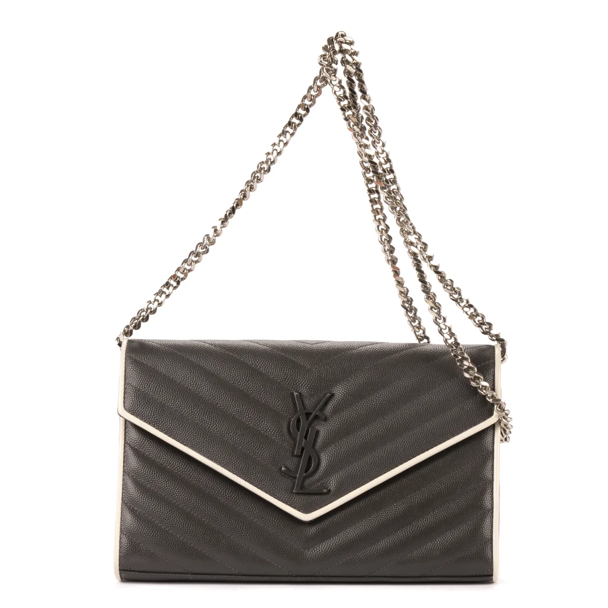 Yves Saint Laurent Tassen Cassandre Enveloppe Chain Wallet Schoudertas in de Grijs/Wit Kalfsleer in de Zilver hardware. Het product is in In Perfecte Staat (AA). Afmetingen: 22x14x4 cm Inclusief accessoires: None BrandCo Paris vindt zeldzame artikelen in de beste staat voor ongelooflijke prijzen. Het is de moeite waard om geduldig te zijn! Koop met vertrouwen: alle artikelen van BrandCo Paris worden zorgvuldig geselecteerd en geverifieerd door ons team van experts. Alle artikelen worden geleverd met een certificaat van echtheid en verpakt door BrandCo Paris. Classificatietabel voor de conditie van het artikel: N (als nieuw) AA (perfecte staat) A (uitstekende staat) AB (zeer goede staat) B (goede/redelijke staat)