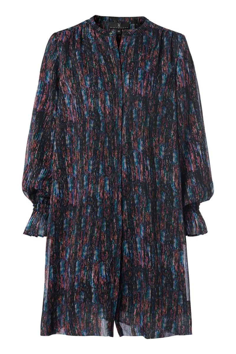 De Cassidy tuniek, ontworpen door Mart Visser, belichaamt zowel stijl als veelzijdigheid, met oogstrelende details die niet onopgemerkt blijven. De tuniek wordt gesierd door een levendige en vlekkerige Multi print, waarbij een diepe zwarte achtergrond harmonieus samengaat met levendige rode, witte en blauwe kleuraccenten. De subtiele smock-effecten op de manchetten en vooral op de rug voegen een verfijnde toets toe aan het ontwerp. Deze tuniek heeft een fluweelzachte pasvorm die elegant boven de knie valt. Met een opstaand kraagje en een verfijnde blinde knoopsluiting aan het voorpand, wordt een strakke en verfijnde afwerking gegarandeerd. Deze creatie is samengesteld uit 95% polyester en 5% metallic, wat resulteert in zowel comfort als een lichte draagbaarheid. De dunne polyester voering zorgt ervoor dat de tuniek soepel valt en zijn vorm behoudt, waardoor de perfecte pasvorm wordt gewaarborgd.Voor een naadloze combinatie draag je de Cassidy tuniek met een elegante zwarte legging. Deze legging, gehuld in tijdloos zwart, vormt een harmonieuze match met de tuniek. Bovendien biedt het zwarte Heather jacket, vervaardigd van luxueus geweven materiaal, een prachtige aanvulling op de lichte stof van de tuniek, wat leidt tot een intrigerende en stijlvolle uitstraling. Als alternatief kun je kiezen voor een comfortabele combinatie door de Cassidy tuniek te dragen met een grof kabelvest in een levendige pink- of kobaltkleur. Deze gewaagde kleurcombinaties zullen ongetwijfeld een stralende indruk achterlaten. Met de Cassidy tuniek ben je voorbereid op zowel casual gelegenheden als feestelijke gelegenheden. De veelzijdigheid van dit kledingstuk staat garant voor een opvallende verschijning, terwijl de aandacht voor detail en de uitgesproken kleurcombinaties een ware blikvanger creëren.