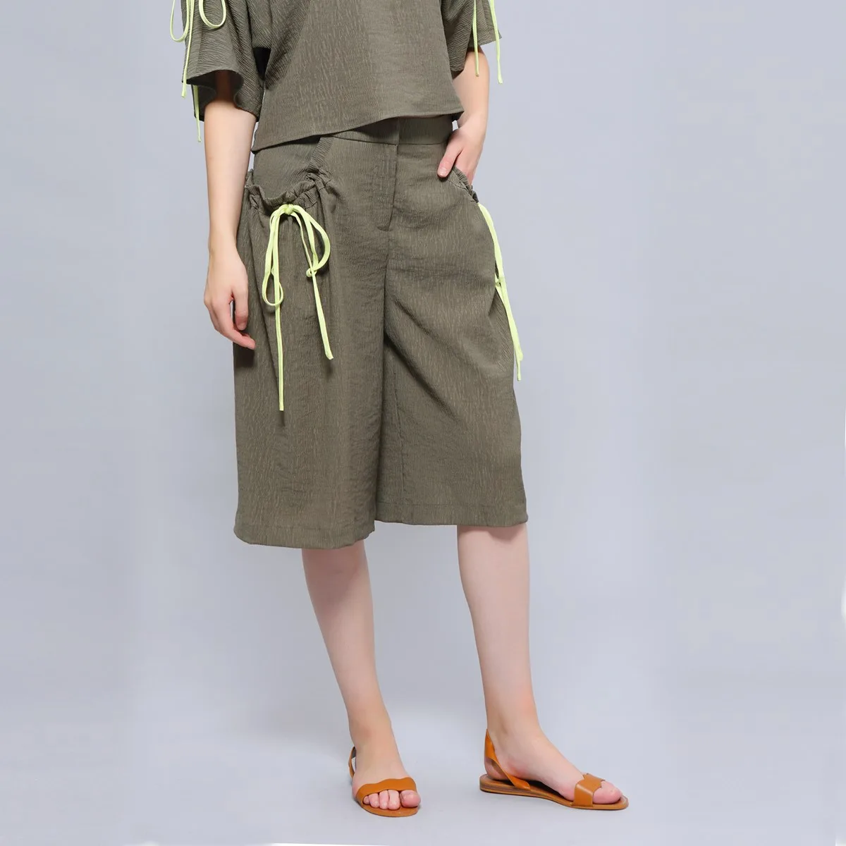 Een comfortabel en moeiteloos stuk met brede verzamelde zak versterkt met knopen. Geschikt voor de heetste dag van de zomer met zijn gestructureerde ademende zachte stof. Gemakkelijk te matchen met T-shirts, shirts en blouses. Productengegevens • Vorm: recht en breed • Lengte: 69 cm • Vlieg en haak vooraan