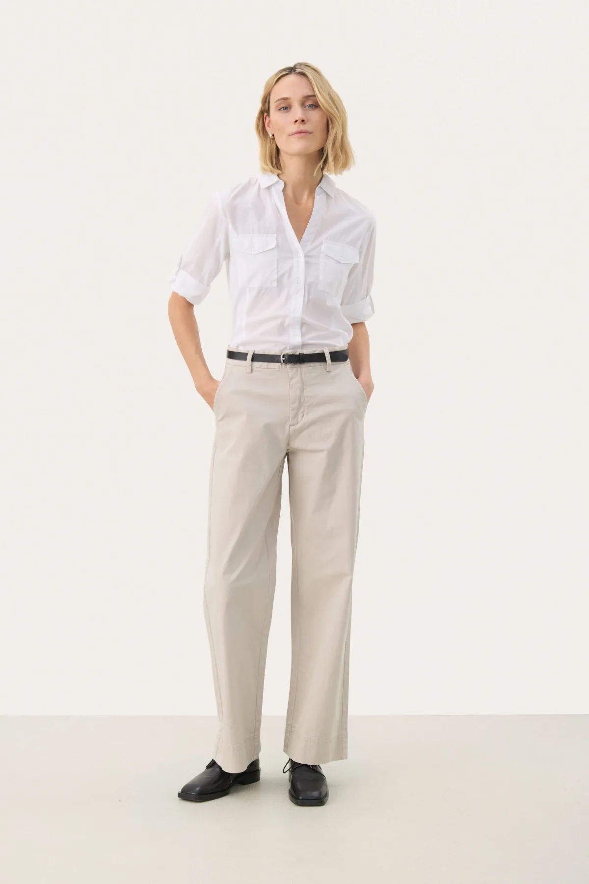 Deze damesbroek met wijde pijpen heeft een rechte, comfortabele pasvorm en een middelhoge taille. Afgewerkt met rits- en knoopsluiting en riemlussen. Geschikt voor diverse gelegenheden en eenvoudig te stylen.