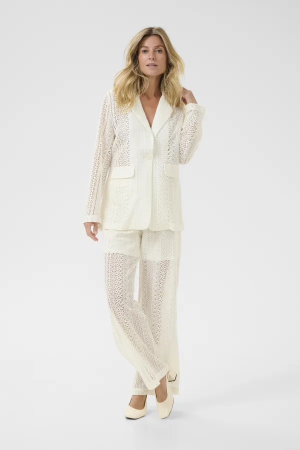 Deze broek heeft een recht model met volledig kant en verticaal patroon. Het ontwerp valt op volledige lengte en is doorschijnend vanaf het dijbeen.