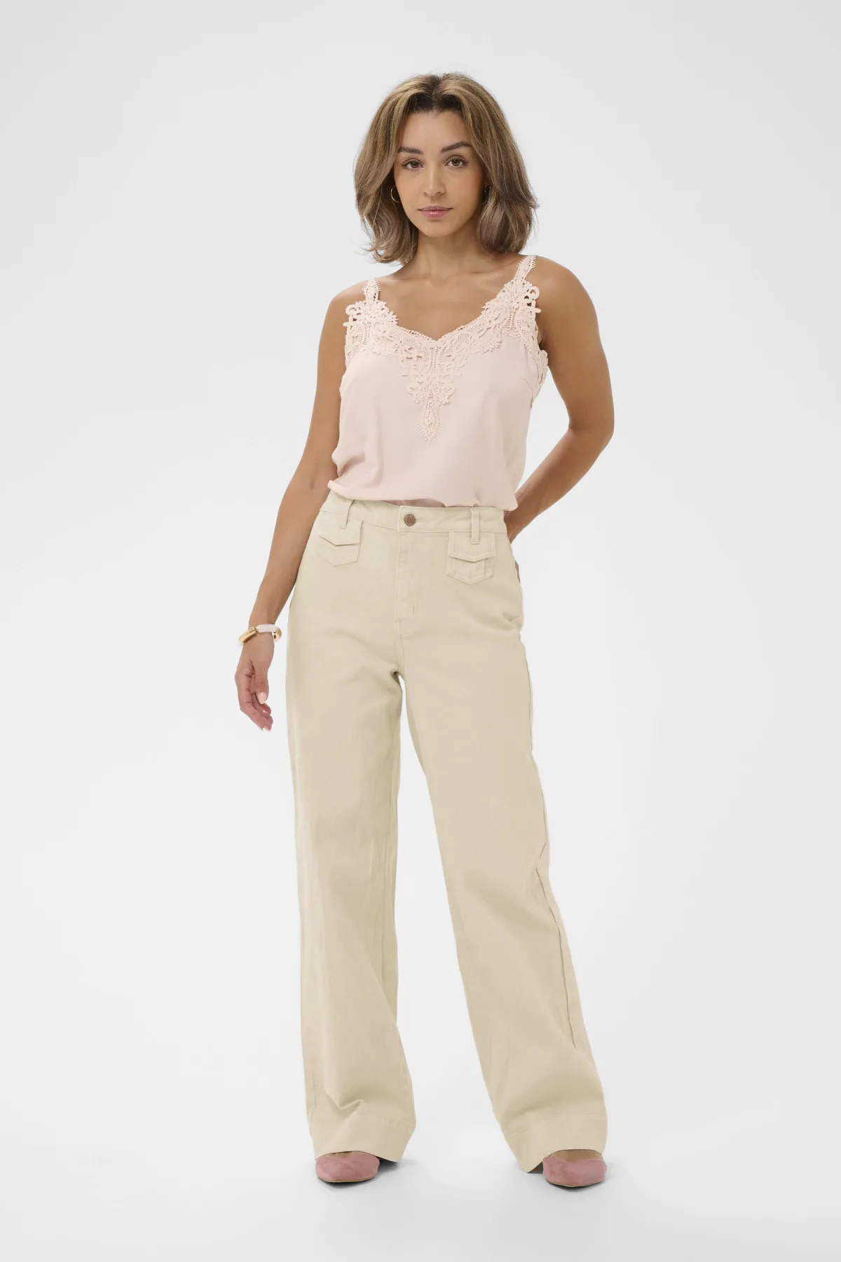 Wijde broek met losse pasvorm, middenhoge taille en opvallende klepzakken aan de voorkant. Volledige pijplengte met zachte structuur.