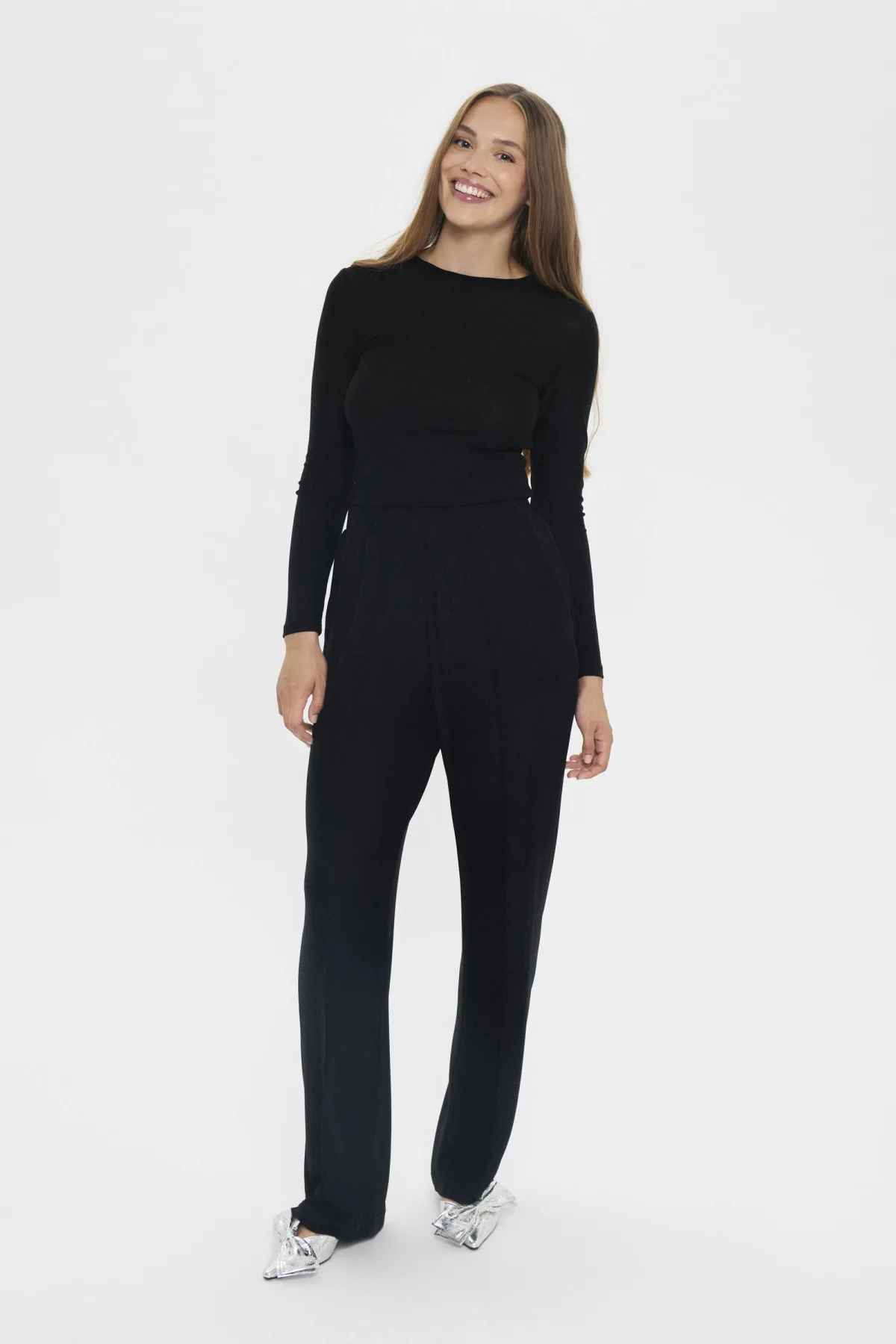 Deze broek heeft een wijde pijp en een hoge taille met elastische band. De stof heeft een subtiel glanzend, licht getextureerd uiterlijk. De pasvorm is los en valt vol over de benen.