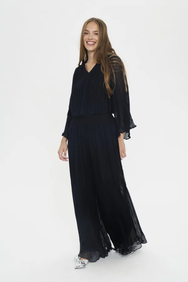 Wijdvallende geplisseerde broek met een luchtige uitstraling. Elastische tailleband en smalle verticale plooien over de volledige lengte.