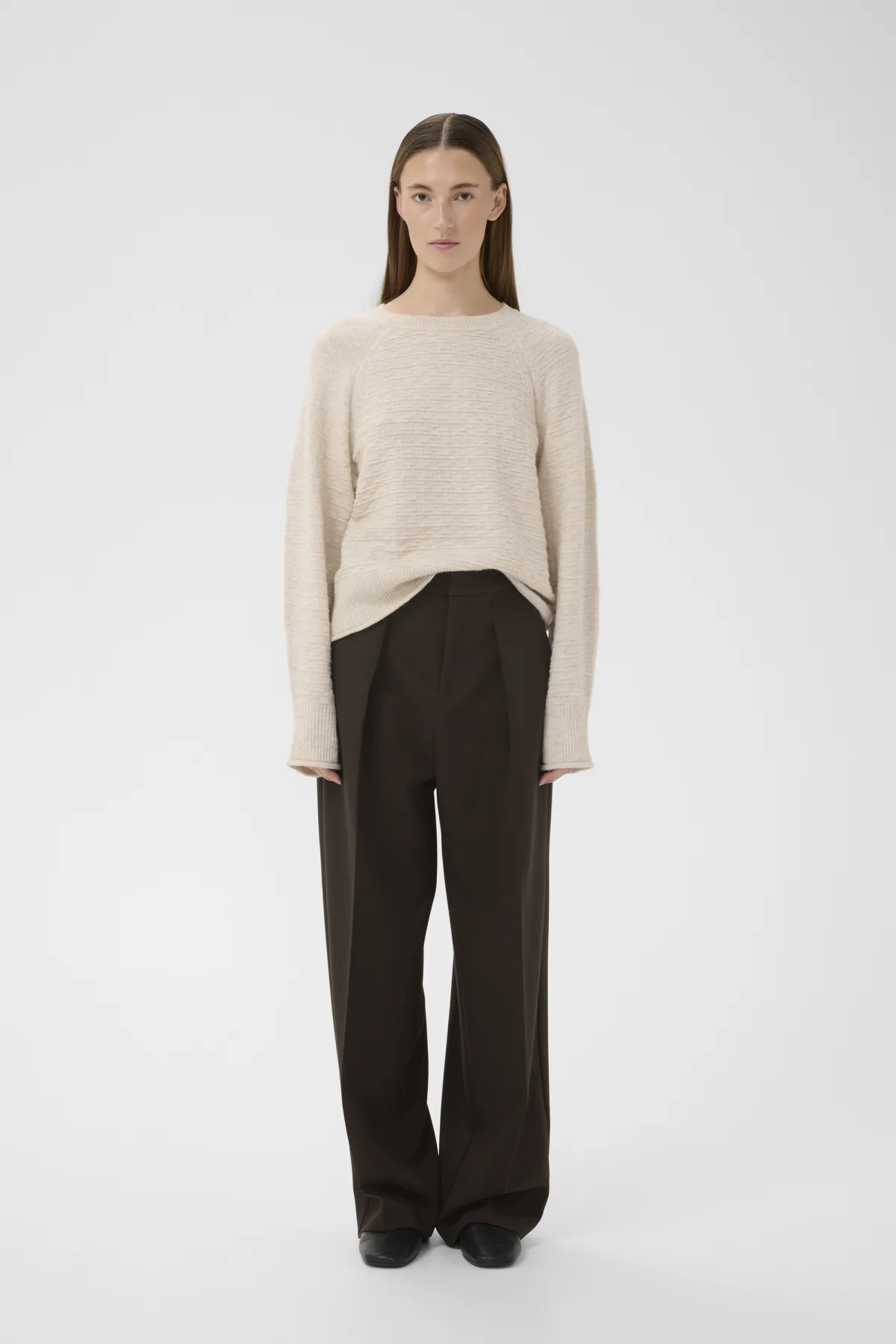 Wijdvallende broek met hoge taille, geaccentueerde plooien en een lang, recht silhouet. Strakke lijnen en een gladde afwerking voor een moderne look.