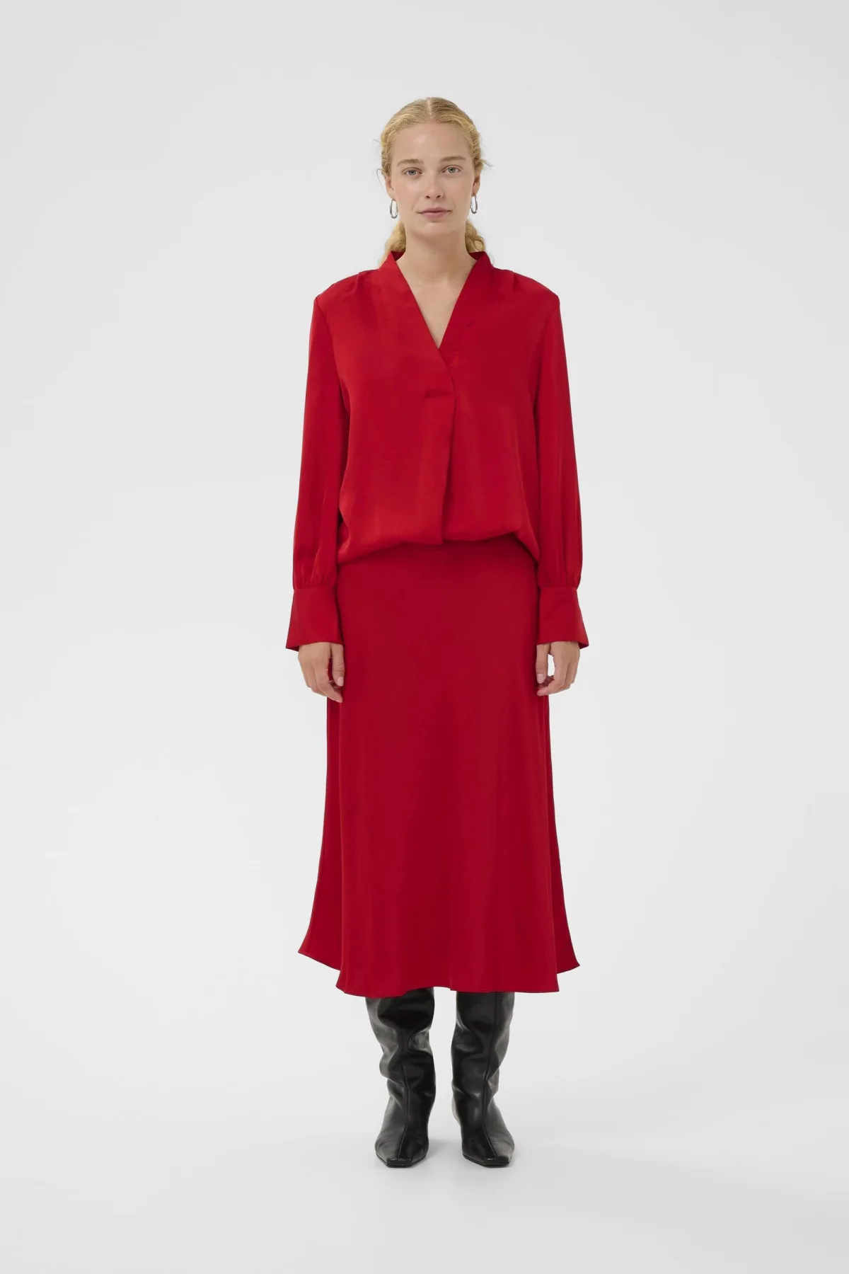 Midi-rok met soepele A-lijn en opvallende bloemenmotieven, gladde, licht glanzende uitstraling. Rechte tailleband, zwierende lengte tot halverwege de kuit.