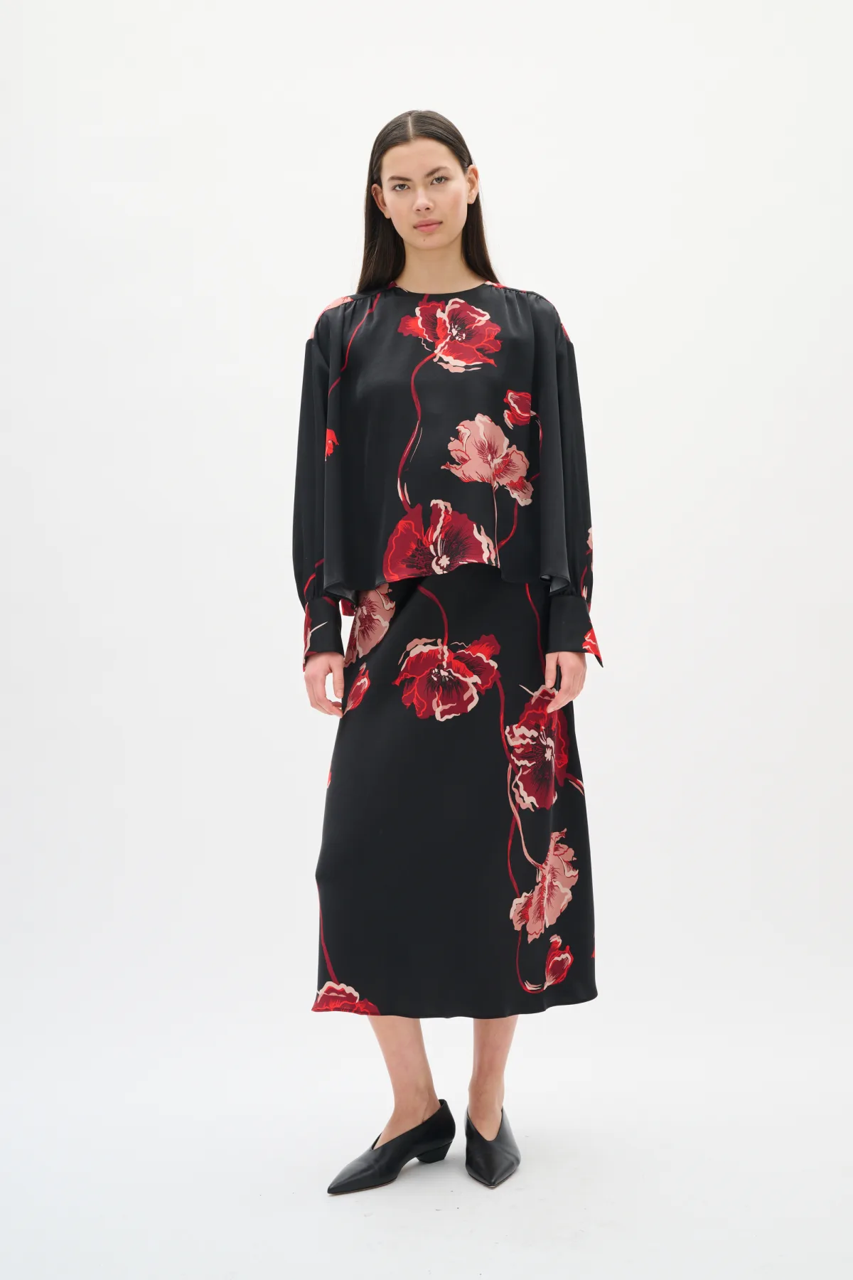 Midi-rok met soepele A-lijn en opvallende bloemenmotieven, gladde, licht glanzende uitstraling. Rechte tailleband, zwierende lengte tot halverwege de kuit.