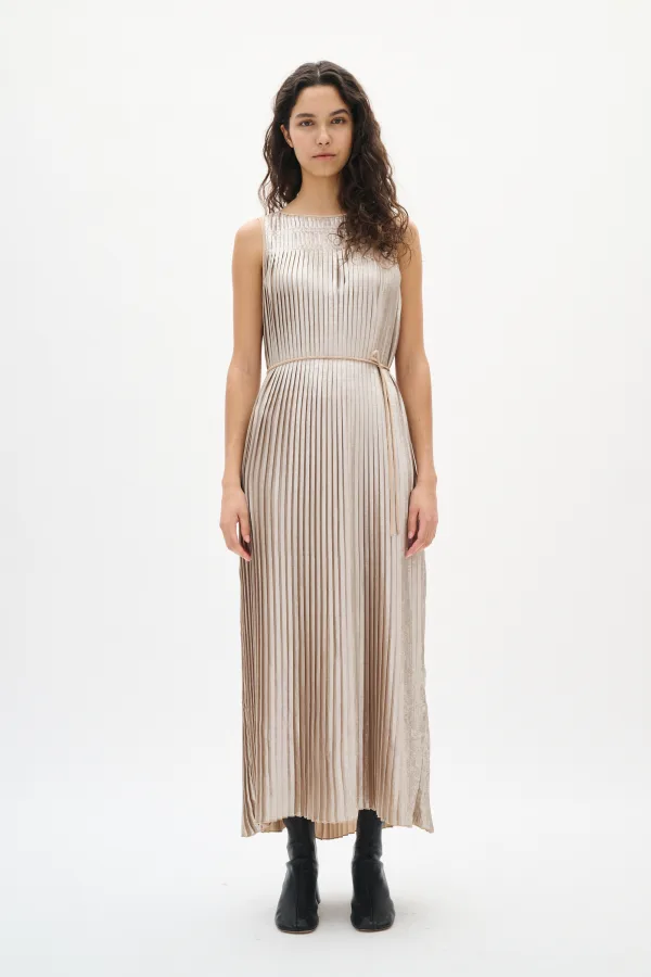 Deze midi-jurk met plissé heeft een mouwloos silhouet, ronde hals en subtiele glans, geaccentueerd met een dun ceintuur in de taille.