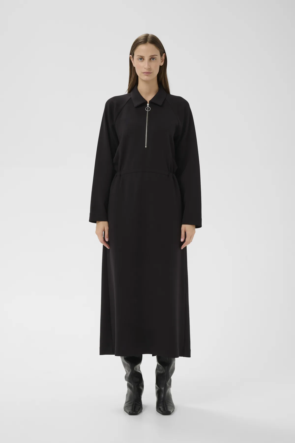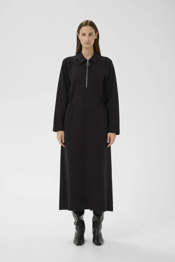 Deze midi-jurk heeft een rechte pasvorm, overhemdkraag en lange raglanmouwen. De zichtbare rits aan de hals geeft een moderne twist aan het ontwerp.
