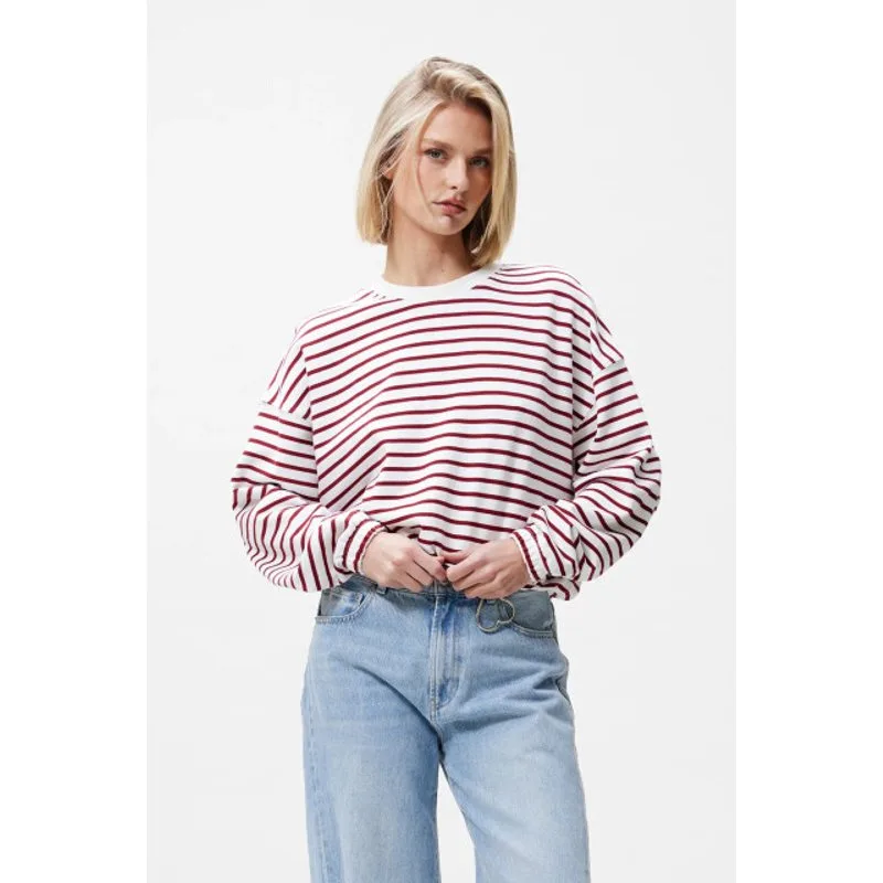 Deze gestreepte sweater heeft elastiek aan de onderkant en bij de mouwen, waardoor deze perfect op je broek valt.Kleur: rhubarb Materiaal: 100% organic cotton Het model is 176cm en draagt maat 36