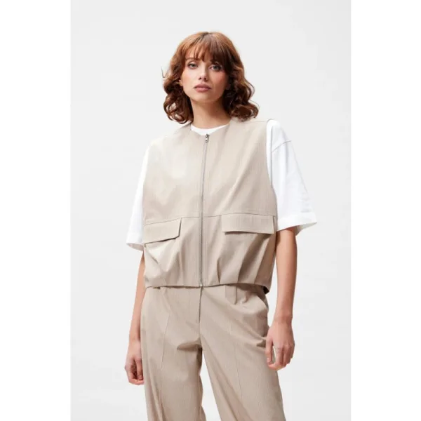 Een bodywarmer die je zowel binnen als buiten kunt dragen, uitgevoerd in een fijne pinstripe voor een speelse, maar carefree look. Match hem met de bijpassende pantalon voor een complete look.Kleur: cement Materiaal: 67% Polyester, 29% Rayon, 4% Spandex Het model is 176cm en draagt maat 36