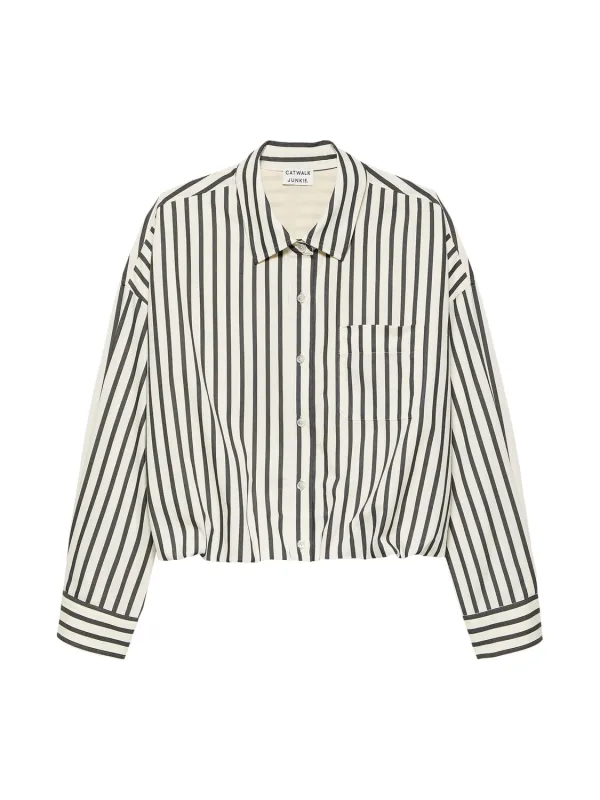 De Blouse Tuck in van Catwalk Junkie is een stijlvolle dames blouse met opstaande kraag en lange mouwen. De casual streepjespatroon, losse pasvorm en knoopsluiting maken het een veelzijdig kledingstuk. Ideaal voor een modieuze, ontspannen look, voorzien van een handige borstzak.