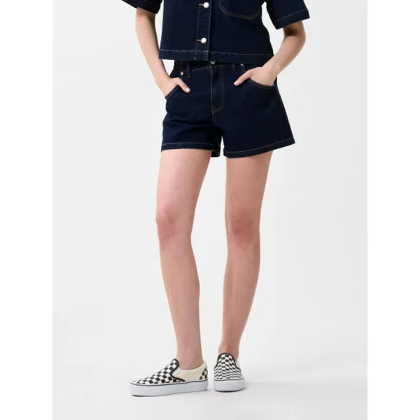 Denim short met elastische band voor een relaxte fit. Kleur: Dark Blue Materiaal: 76% cotton 23% polyester 1% elastane Het model is 1.76m lang en draagt maat 27