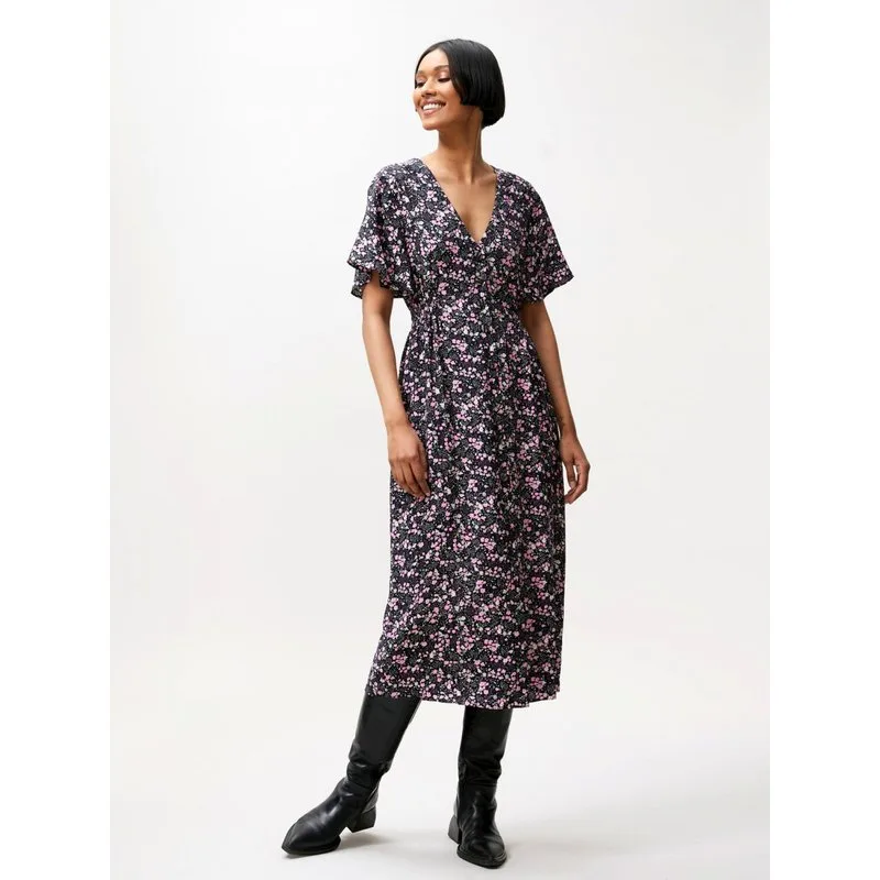 Heerlijke jurk van Catwalk Junkie. Bloemetjes motief met zwart. 100% viscose Valt normaal. Leuk te dragen met bijv ook stoere sneakers. Model draagt mt S. Sluiting met knopen