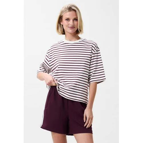 Frisse strepen en een zachte stof komen samen in dit Catwalk Junkie dames T-shirt in ecru met donkerrood. Het shirt heeft een streepdessin dat goed combineert met je favoriete denim, rok of short. De ronde hals en korte rechte mouwen zorgen voor een relaxte uitstraling, terwijl de pasvorm ruimte laat om comfortabel te bewegen. Gemaakt van 100% katoen voelt het T-shirt soepel aan op de huid en is het geschikt om de hele dag te dragen, zeker in het voorjaar en de zomer.Gestreept T-shirt voor elke dag Ecru/donkerrood streepdessin voor een rustige maar duidelijke look Gemaakt van 100% katoen voor een ademende en zachte touch Ronde hals die aansluit zonder te hoog te zitten Korte rechte mouwen voor een casual, ontspannen uitstraling Geen borstzak, waardoor het dessin rustig en strak blijft Onderdeel van de Rebel collectie, passend bij een eigentijdse stijlCasual stijl voor lente en zomerDit T-shirt is geschikt voor alledaagse outfits in de lente en zomer. Draag het losjes op een mom jeans met sneakers, of gecombineerd met een shorts en sandalen op een warme middag. De katoenen kwaliteit maakt het een praktische basis voor drukke dagen, uitstapjes of een casual werkdag.Catwalk Junkie: herkenbare stijl met aandacht voor detailsCatwalk Junkie ontwerpt kleding met een eigen karakter die makkelijk te dragen is. Prints, kleuren en details worden gecombineerd tot items die net even anders zijn, terwijl ze eenvoudig te stylen blijven. Met dit T-shirt haal je een basisstuk in huis dat past binnen een moderne, vrouwelijke garderobe.Een gestreepte basic met karakter die je vaak uit de kast pakt.