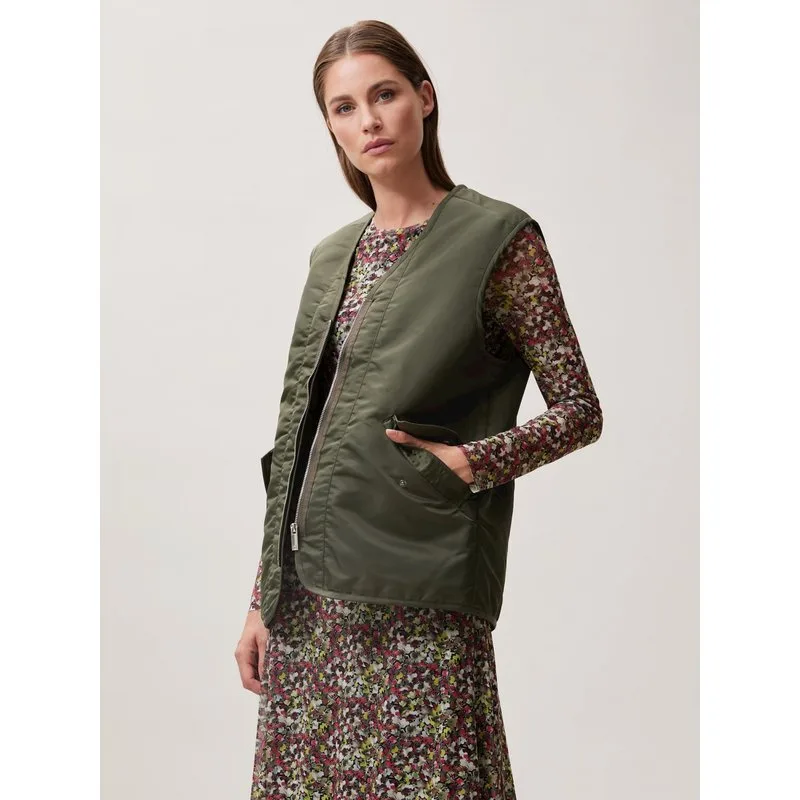 Onze ‘Venne’ is een aan de binnenkant doorgestikte bodywarmer in een tijdloze groene tint. De mouwloze stijl heeft een losvallende pasvorm met een V-hals, een ritssluiting voor en twee klepzakken met drukkers. Gemaakt van 100% nylon. Oversized Floor is 1.78m en draagt maat 36 100% nylon Designed in Amsterdam