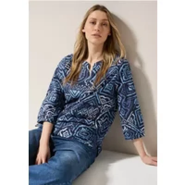 Deze bedrukte katoenen blouse van CECIL heeft een grafisch dessin en een halsopening met split en een decoratieve knoopsluiting. De 3/4-mouwen en afgeronde zoom met zijsplitten zorgen voor een comfortabele pasvorm. Puur katoen garandeert een hoog draagcomfort.