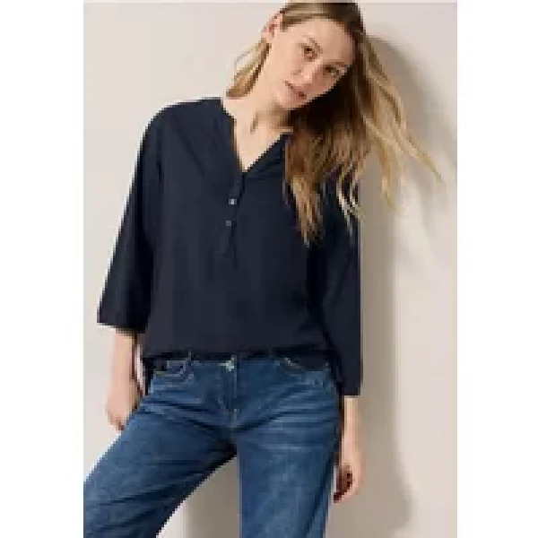 Deze effen blouse van CECIL voor dames heeft eenvoudige details zoals een halsopening met split en een decoratieve knoopsluiting. De 3/4 mouwen met elastische manchetten en een afgeronde zoom met zijsplitten zorgen voor een vrouwelijk silhouet. De zachte viscose voelt comfortabel aan op de huid.