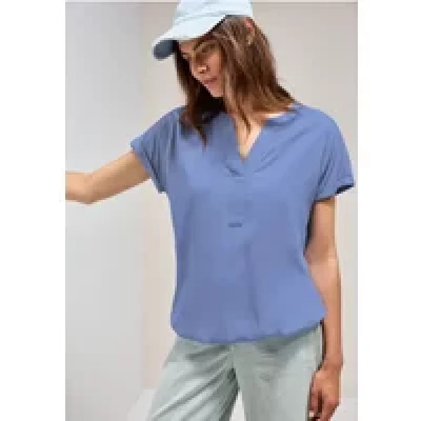 Deze damesblouse met korte mouwen van CECIL maakt indruk met zijn eenvoudige, veelzijdige ontwerp. De halsuitsnijding met split geeft hem een vrouwelijke touch, terwijl de elastische zoom voor een losse pasvorm zorgt. De zachte viscose voelt aangenaam licht aan op de huid - perfect voor ongecompliceerde alledaagse looks.