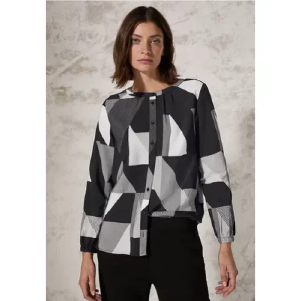 Deze blouse met grafisch dessin van CECIL voor dames heeft een ronde halslijn en lange mouwen met manchetten. De aangename viscosemix zorgt voor optimaal comfort en de afgeronde zoom rondt de look perfect af.