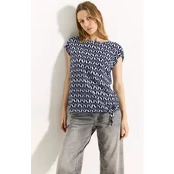 CECIL dames zomerblouse met print, ronde hals, knoop aan de zoom, zachte viscosestof, langere snit aan de achterkant