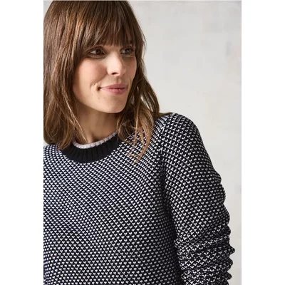 De gebreide trui met patroon van CECIL voor dames heeft een ronde hals en een grafisch patroon. De boorden met lange mouwen en de zachte katoenmix maken hem bijzonder comfortabel om te dragen. Glitterdetails in het patroon zorgen voor sprankelende accenten.