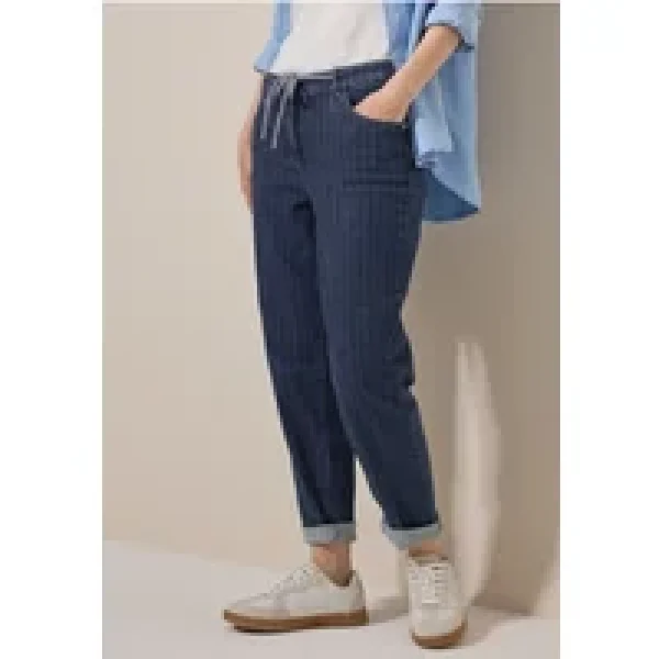 Deze casual fit jeans van CECIL voor dames is een modieuze metgezel. Deze jeans heeft krijtstrepen, een mid-waist en slanke pijpen en een tailleband met trekkoord. Het 5-pocket ontwerp en de materiaalmix met stretch maken het de perfecte keuze.