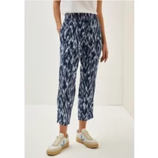 Deze broek van CECIL voor dames is bijzonder comfortabel met een Mid Waist en ontspannen casual pasvorm. De elastische tailleband met trekkoord en zachte viscose zorgen voor extra comfort, terwijl het grafische patroon een zomers accent toevoegt.