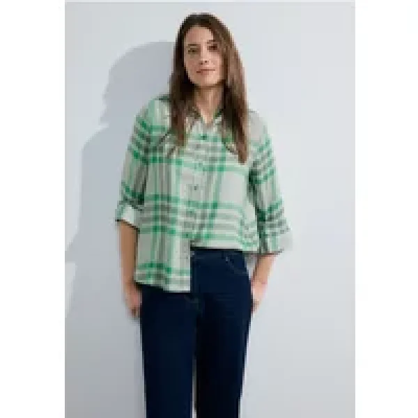CECIL damesblouse, shirtkraag, knooppas, ruitpatroon, lange turn-up-mouwen