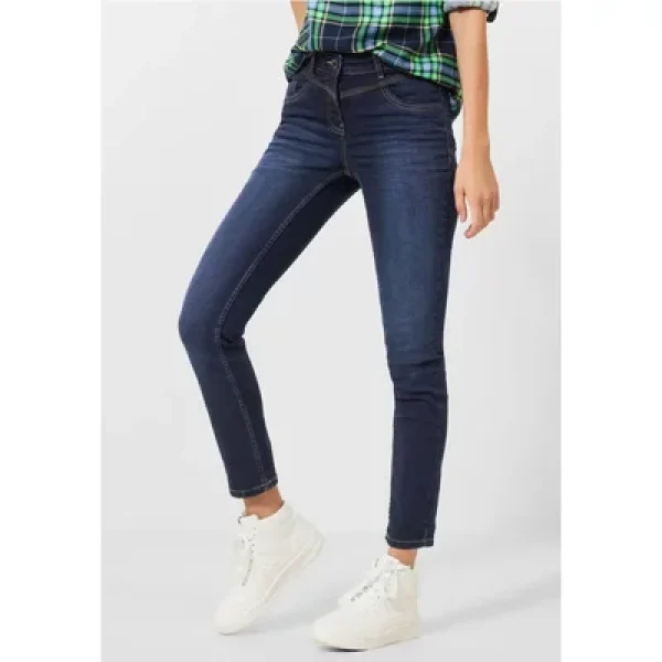 CECIL, slim fit jeans, hoge taille, smalle pijpen, donkerblauwe wassing, rits en knoop, 5-pocketstijl