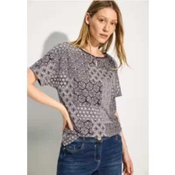 CECIL dames-T-shirt met patchworkprint, shirt met korte mouwen, U-boothals met split voor, zijsplitten in de zoom, zachte katoen-modalmix