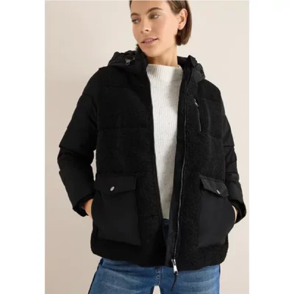 Dit teddyjack van CECIL voor dames zal je bekoren met zijn moderne structuurmix en zachte voering. Een capuchon met trekkoord, opgestikte zakken met fleecevoering en een praktische borstzak met ritssluiting zorgen voor warmte en functionaliteit. Metalen details voegen stijlvolle accenten toe en maken dit jack tot een favoriet voor koude dagen.