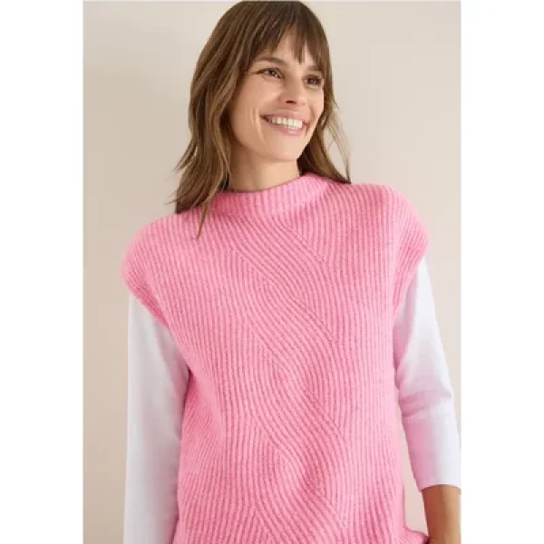 Deze zachte trui van CECIL voor dames heeft een col, kabelgebreide details en zijsplitten. De trui heeft geen mouwen en is perfect voor stijlvolle laagjeslooks met een gebreid karakter. Een knus it-stuk met een modieuze twist.