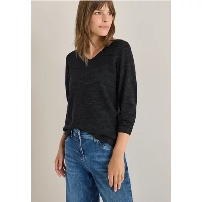 De V-hals trui in de stijl Heather van CECIL voor dames heeft een moderne gemêleerde look met zijsplitten voor meer bewegingsvrijheid. De V-hals en lange mouwen benadrukken de vrouwelijke snit. Een comfortabele klassieker voor ontspannen alledaagse outfits.
