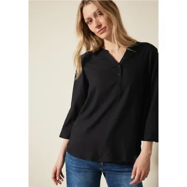 De effen tuniek van CECIL voor dames is een zomerse blouse met een afgeronde zoom. Het heeft een ronde hals met een split en een decoratieve knoopsluiting en 3/4 mouwen met manchetten. De zachte Voskose kwaliteit maakt de tuniek comfortabel om te dragen.