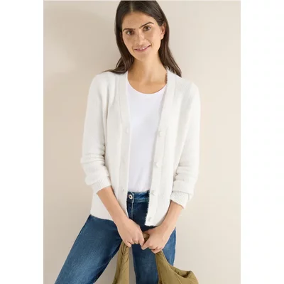 Pluizig en vrouwelijk: het vest van verengaren van CECIL voor dames zal je bekoren met zijn zachte stof en elegante V-hals. De knoopsluiting en lange mouwen maken het de ideale metgezel voor gezellige alledaagse momenten met een modieus tintje.