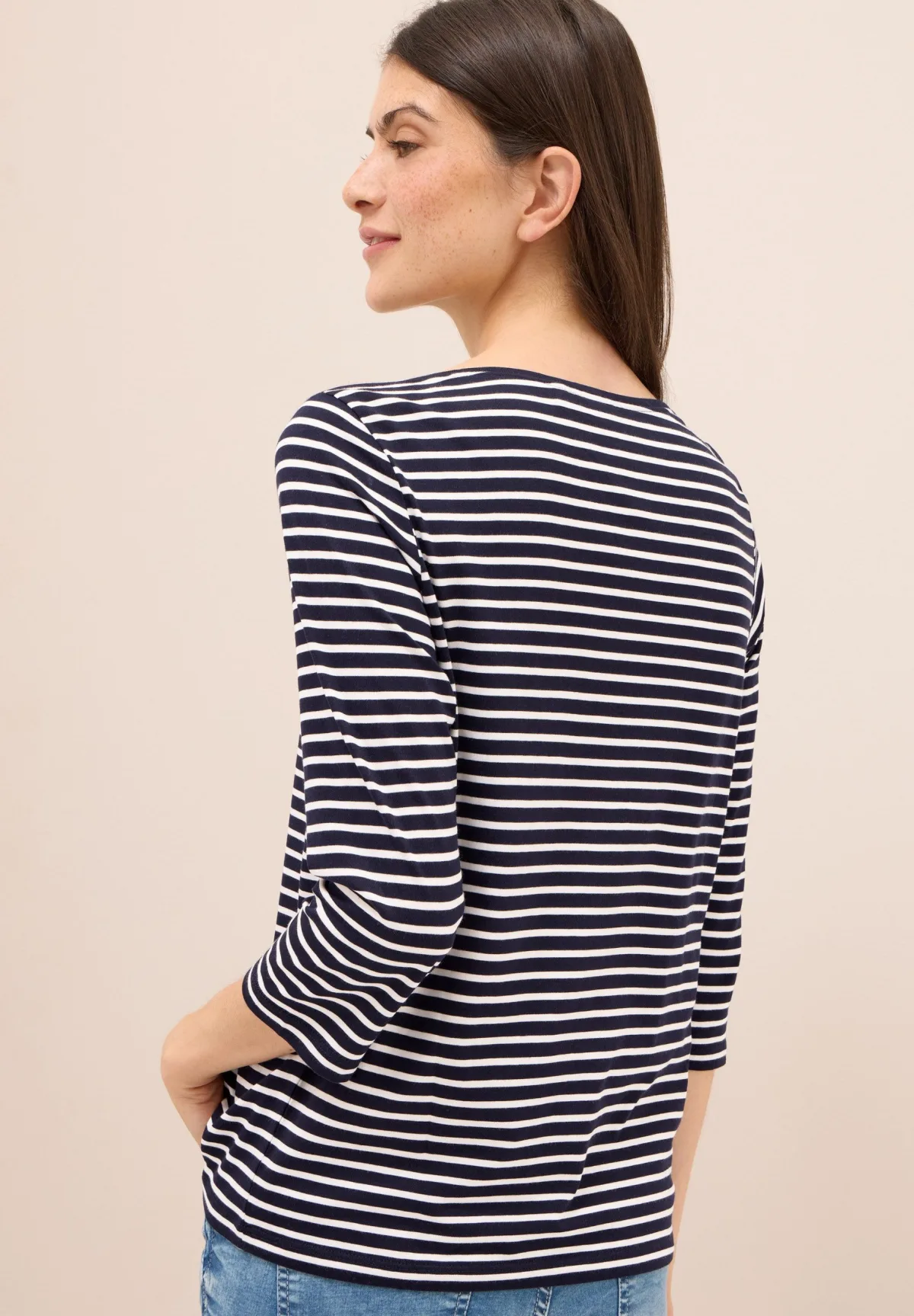 Dit gestreepte Shirt van CECIL voor dames heeft een klassieke boothals en 3/4-mouwen. De zachte katoen-modaalmix zorgt voor aangenaam draagcomfort, terwijl het gestreepte patroon tijdloos en veelzijdig is. Ideaal voor een ongecompliceerde alledaagse look.