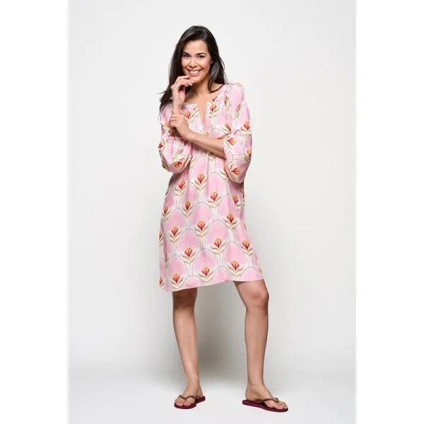Zomerse zijden tuniek-jurkDe lichtroze Cecilia tuniek uit de collectie van Caroline Tensen is een luchtige zijden jurk die direct een zomers gevoel oproept. De zachte roze tint en subtiele zomerse print geven de tuniek een frisse, elegante uitstraling. Dankzij de losvallende pasvorm valt de zijden tuniek comfortabel en eindigt net boven de knie. De maatvoering is normaal.Wat deze zijden tuniek-jurk extra bijzonder maakt, zijn de speelse details: de volumineuze ballonmouwen zorgen voor beweging en luchtigheid, terwijl het contrasterende koord met kwastjes bij de hals een verfijnd accent toevoegt.