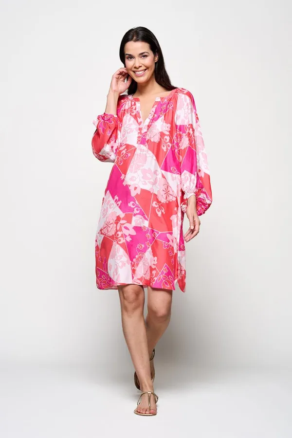 Zomerse zijden tuniekDe roze Cecilia tuniek uit de collectie van Caroline Tensen is een luchtige dames tuniek die perfect is voor warme dagen. Gemaakt van 100% zijde, voelt de tuniek soepel aan en draagt licht en comfortabel op de huid. Met een losvallende pasvorm die net boven de knie eindigt, biedt hij een ontspannen en luchtige uitstraling.De kracht van deze zijden tuniek zit in de verfijnde details: de volumineuze ballonmouwen geven een speels accent, terwijl de subtiele zomerse print zorgt voor een frisse en natuurlijke look. Dankzij de zachte zijde voelt de tuniek luxe aan, zonder dat hij zwaar of benauwend wordt – ideaal voor een comfortabele en elegante zomerse outfit.