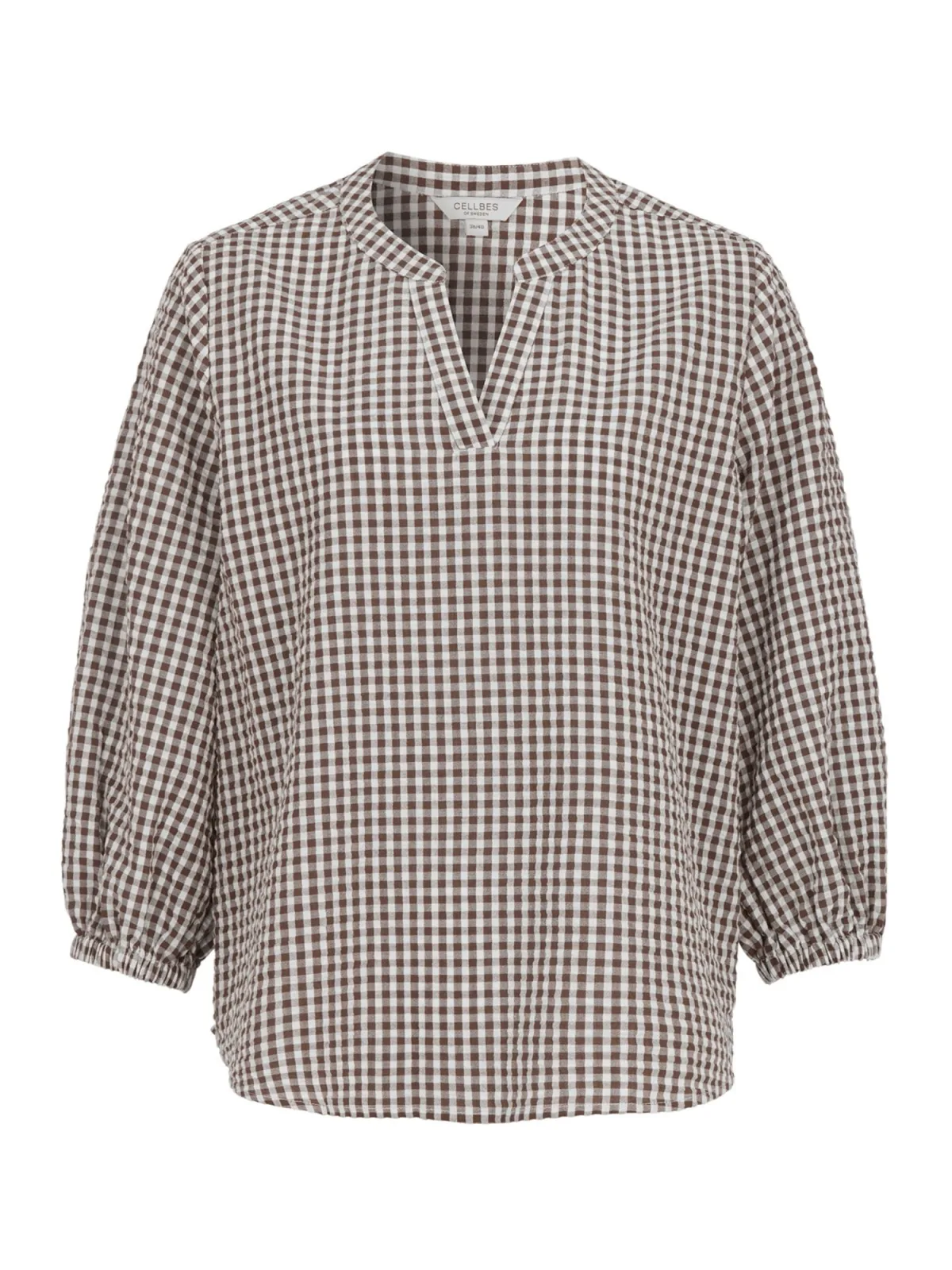 Blouse type: Blouseshirt; Design: Gevoerde zoom/rand, Pofmouwen, Overcut schouder; Materiaal: Katoen; Motief: Geruit; Kraag: Tuniek kraag; Details: Gedrapeerd; Extra's: All-over patroon; Pasvorm: Losse pasvorm; Armlengte: Driekwart mouw; Lengte: Normale lengte