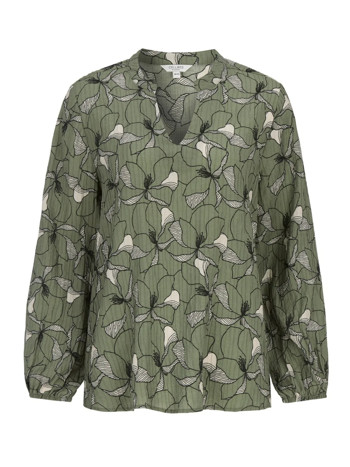 Blouse type: Blouseshirt; Design: Rechte zoom; Materiaal: Viscose; Motief: Bloemenprint; Kraag: Zonder kraag; Details: Gedrapeerd; Extra's: All-over patroon; Pasvorm: Normale pasvorm; Armlengte: Lange mouw; Lengte: Normale lengte