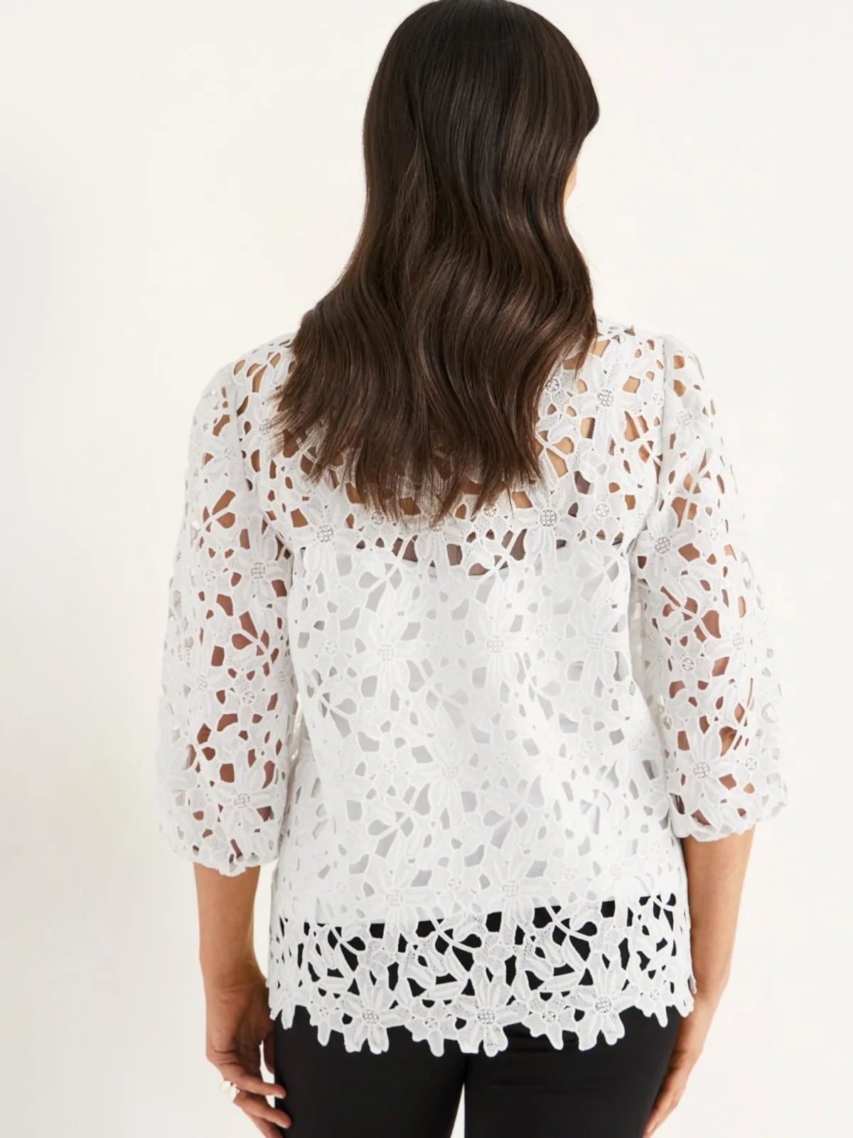 Blouse type: Blouseshirt; Design: Asymmetrische zoom; Motief: Effen; Kraag: Zonder kraag; Details: Kant, Mesh; Extra's: Voelt zacht aan; Pasvorm: Normale pasvorm; Armlengte: Driekwart mouw; Lengte: Normale lengte