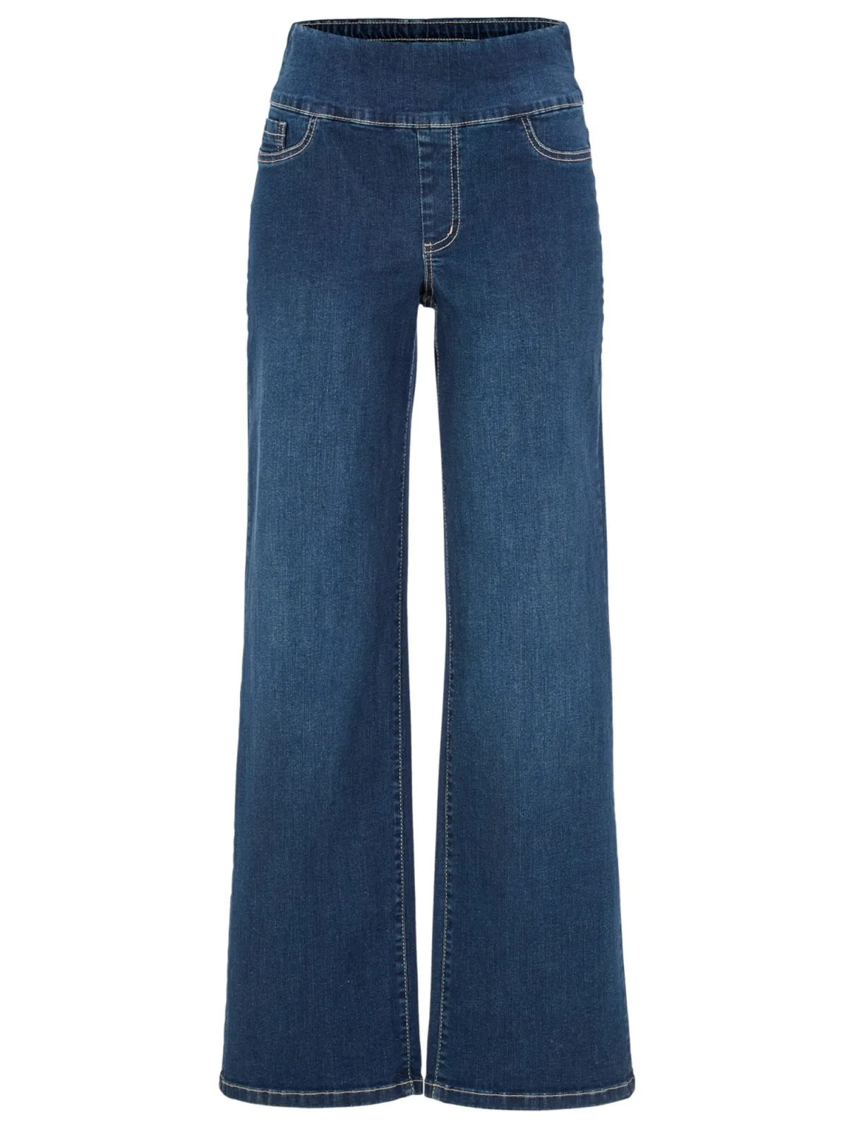 Design: Elastische taille/zoom; Materiaal: Denim; Motief: Effen; Extra's: Contrasterende naden; Wassing: Blauw denim; Lengte: Lang/maxi; Pasvorm: Wide leg; Taillehoogte: High waist
