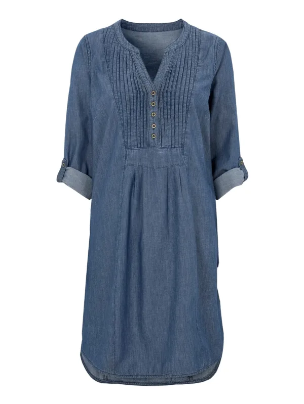 Type sluiting: Knoopsluiting; Materiaal: Denim; Halstype: Uitgesneden hals; Motief: Effen; Details: Plooien; Lengte: Knielengte; Snit: Recht; Pasvorm: Normale pasvorm; Armlengte: Lange mouw