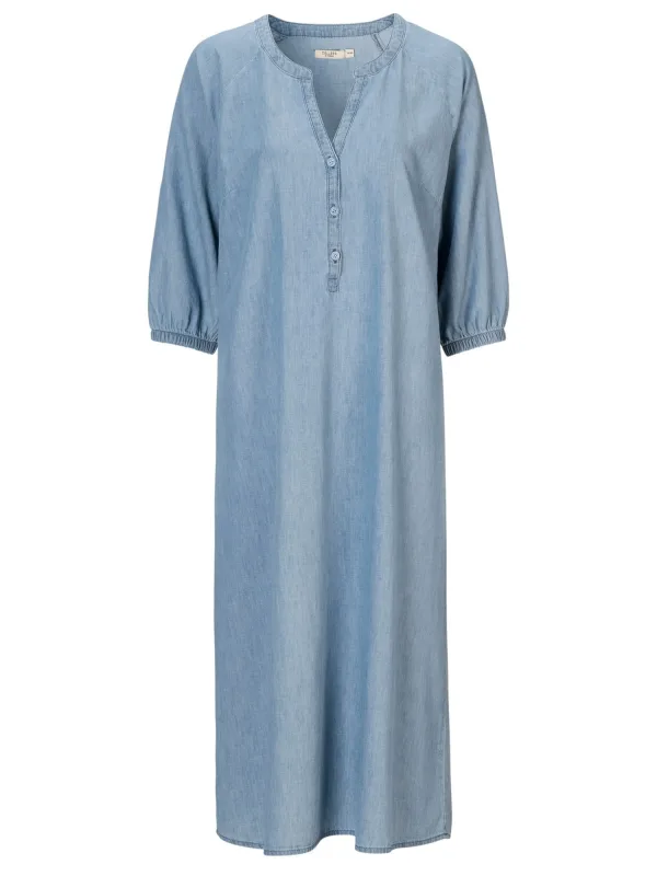 Design: Diepe snit/decolleté; Type sluiting: Knoopsluiting; Materiaal: Denim; Halstype: V-hals; Motief: Effen; Kraag: Zonder kraag; Details: Gedrapeerd; Extra's: Vaste grip; Lengte: Knielengte; Snit: Recht; Pasvorm: Normale pasvorm; Armlengte: Driekwart mouw