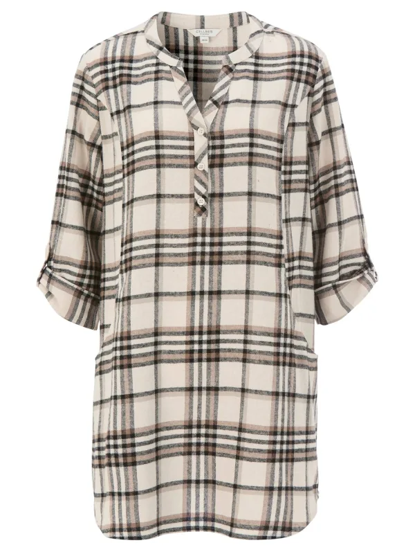 Design: Ronde zoom; Type sluiting: Knoopsluiting; Materiaal: Flanel; Motief: Geruit; Kraag: Tuniek kraag; Details: Plooien; Extra's: All-over patroon; Pasvorm: Losse pasvorm; Armlengte: Lange mouw; Lengte: Lange pasvorm